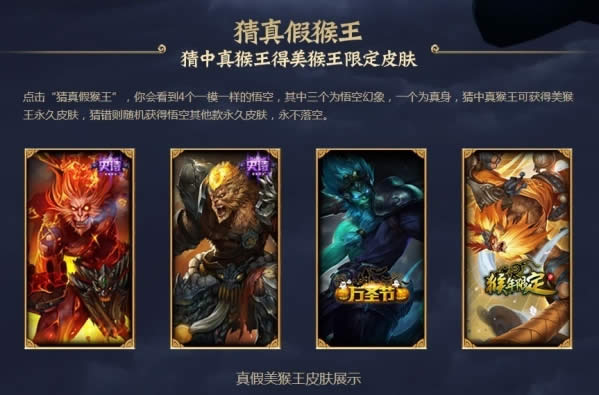 点击“猜真假猴王”,你会看到4个一模一样的悟空,其中三个为悟空幻象,一个为真身,猜中真猴王可获得美猴王永久皮肤,猜错则随机获得悟空其他款永久皮肤,永不落空。