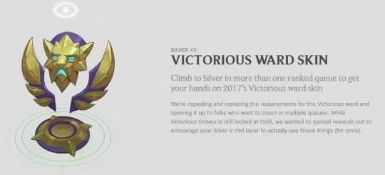 在2017赛季在至少两种排位游戏爬上白银的你将会获得“2017胜利守卫皮肤”。