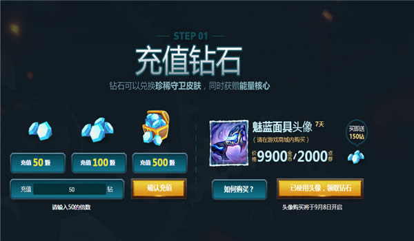 1.在活动页面上使用Q币充值钻石,5Q币充值50钻石。在游戏客户端购买并使用期限头像“魅蓝面具”,赠送150钻石,单个大区头像只限购买一次。充值的钻石会在页面上显示。