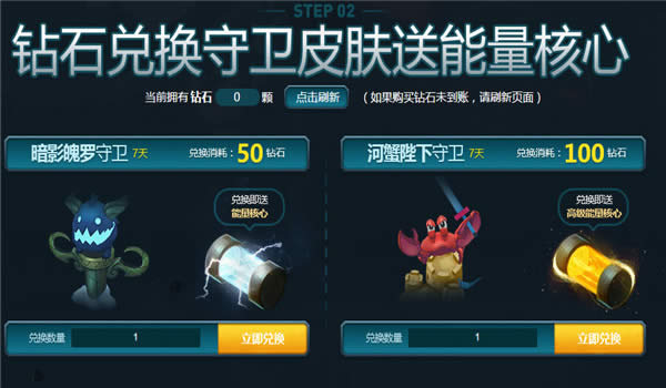 2.使用钻石兑换珍稀守卫皮肤,其中50钻石兑换一份“暗影魄罗守卫(7天)”,赠“能量核心”一份;100钻石兑换一份“河蟹陛下守卫(7天)”,赠“高级能量核心”一份。兑换多份珍稀守卫皮肤,使用时间叠加。