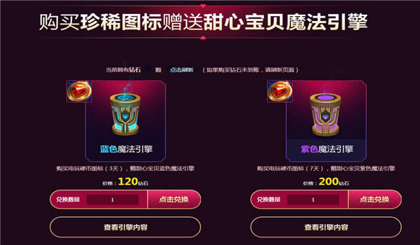 2.使用钻石兑换珍稀图标,其中120钻石兑换一份“电玩硬币图标(3天)”,赠“甜心宝贝蓝色~魔法引擎”一份;200钻石兑换一份“电玩硬币图标(7天)”,赠“甜心宝贝紫色~魔法引擎”一份。兑换多份珍稀守卫皮肤,使用时间叠加。