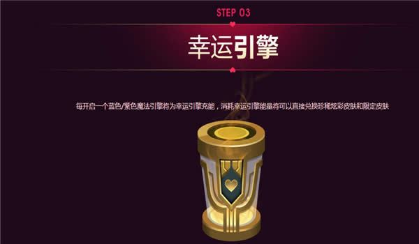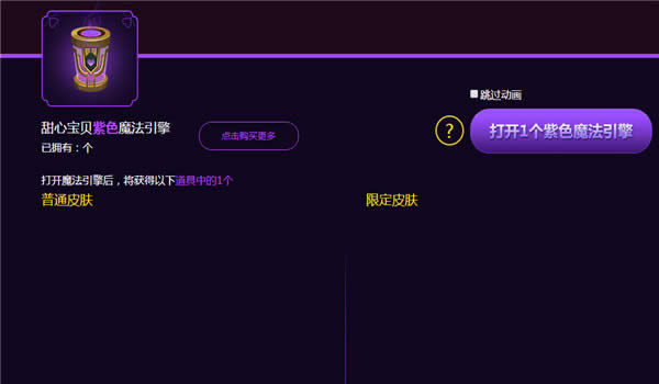 【2】每开启一个蓝色/紫色~魔法引擎将为幸运引擎充能,消耗幸运引擎能量将可以直接兑换珍稀炫彩皮肤和限定皮肤