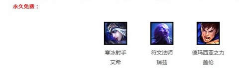 另外,在中国的服务器中,我们额外增加了三个永久免费的英雄——寒冰射手艾希、德玛西亚之力盖伦和符文法师瑞兹。这三个英雄是永久免费供所有玩家使用的。主要目的也是便于那些刚刚打完新手实战训练营的玩家能够至少有一个自己会用的英雄。