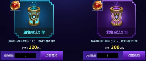 2.使用钻石兑换珍稀图标,其中120钻石兑换一份“电玩硬币图标(3天)”,赠“电玩时代蓝色的魔法引擎”一份;200钻石兑换一份“电玩硬币图标(7天)”,赠“电玩时代紫色的魔法引擎”一份。兑换多份珍稀守卫皮肤,使用时间叠加。