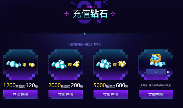 1、在活动页面上使用Q币充值钻石,1Q币充值10钻石。提供钻石礼包,分别是1200颗赠送120颗,2000颗赠送200颗,5000颗赠送600颗。购买其他数额钻石暂无赠送