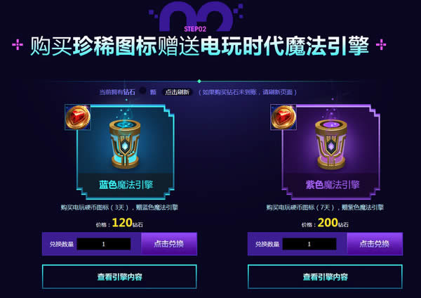 2、使用钻石兑换珍稀图标,其中120钻石兑换一份“电玩硬币图标(3天)”,赠“电玩时代蓝色*魔法引擎”一份;200钻石兑换一份“电玩硬币图标(7天)”,赠“电玩时代紫色*魔法引擎”一份。兑换多份珍稀守卫皮肤,使用时间叠加。