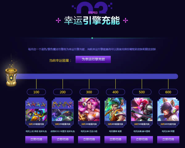 5、打开蓝色*魔法引擎将累计10幸运引擎能量,打开紫色*魔法引擎将累计20幸运引擎能量。分解1个蓝色*魔法引擎赠送的道具累积2点能量,分解1个紫色*魔法引擎赠送的道具累积5点能量。消耗幸运引擎能量可以免费获赠皮肤奖励