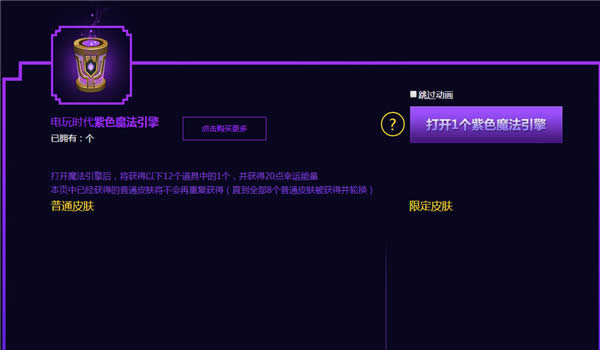 1.每开启一个蓝色/紫魔法引擎将为幸运引擎充能,消耗幸运引擎能量将可以直接兑换珍稀炫彩皮肤和限定皮肤