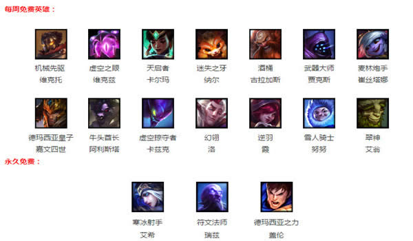 3.另外,在中国的服务器中,我们额外增加了三个永久免费的英雄——寒冰射手艾希、德玛西亚之力盖伦和符文法师瑞兹。这三个英雄是永久免费供所有玩家使用的。主要目的也是便于那些刚刚打完新手实战训练营的玩家能够至少有一个自己会用的英雄。