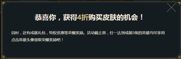 1 活动期间,凡有英雄达到成就5级及以上的召唤师,即可领取成就奖励,获得特权优惠(“虚空之女 卡莎”暂不参与此次活动);