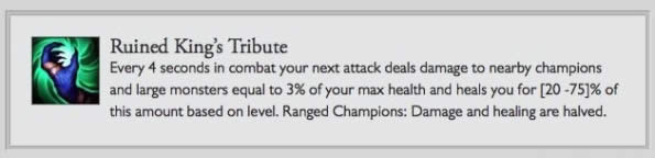 进入战斗后每4秒,你的下一次对英雄或大型野怪的普攻会造成你自身3%最大生命值的额外伤害,同时回复相当于该数值20 -75%的生命值(基于等级),远程英雄伤害和回复量减半