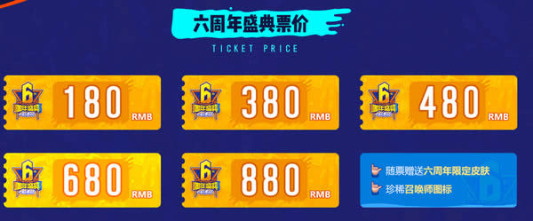 每个购买《英雄联盟》六周年庆狂欢盛典门票的QQ号可获得随票赠送的皮肤以及珍稀召唤师图标。购买880元,680元,480元,380元,180元中任意票价的玩家该购票QQ号可以获赠1个六周年限定皮肤,1个珍稀召唤师图标。
