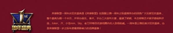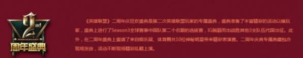 英雄联盟四周年的庆典即将开始,届时在S5代表中国赛区出战的全部名额都将确定,希望LPL的队伍可以在S5拿下我们赛区的第一个世界冠军,也希望明年的五周年庆典更加盛大。