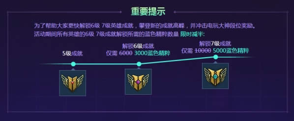 活动期间所有英雄的6级 7级成就解锁所需的蓝色精粹数量 限时减半: