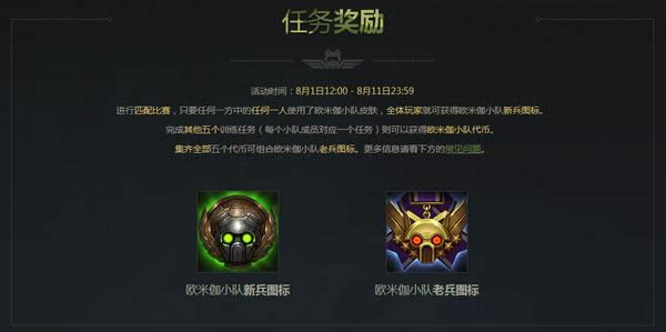 进行匹配比赛,只要任何一方中的任何一人使用了欧米伽小队皮肤,全体玩家就可获得欧米伽小队新兵图标。