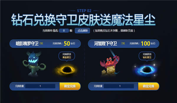 2.使用钻石兑换珍稀守卫皮肤,其中50钻石兑换一份“暗影魄罗守卫(7天)”,赠“黄金星尘”一份;100钻石兑换一份“河蟹陛下守卫(7天)”,赠“钻石星尘”一份。兑换多份珍稀守卫皮肤,使用时间叠加。