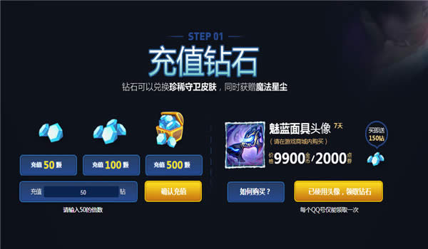 1.在活动页面上使用Q币充值钻石,5Q币充值50钻石。在游戏客户端购买并使用期限头像“魅蓝面具”,赠送150钻石,单个大区头像只限购买一次。充值的钻石会在页面上显示。