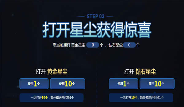 5.本次活动提供“打开10个”功能,每次使用“打开10个”功能会额外赠送并打开1个对应等级的星尘。