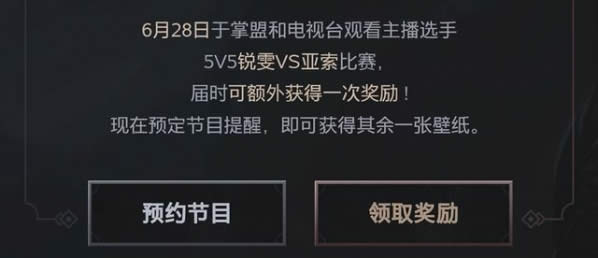 在6月28日那天通过掌盟或者英雄联盟电视台观看主播选手5V5瑞文VS亚索比赛,就可以获得一次抽皮肤机会