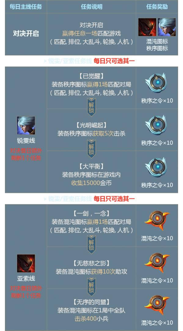 佩戴秩序图标完成日常任务获取秩序之令,佩戴混沌图标完成日常任务获取混沌之令