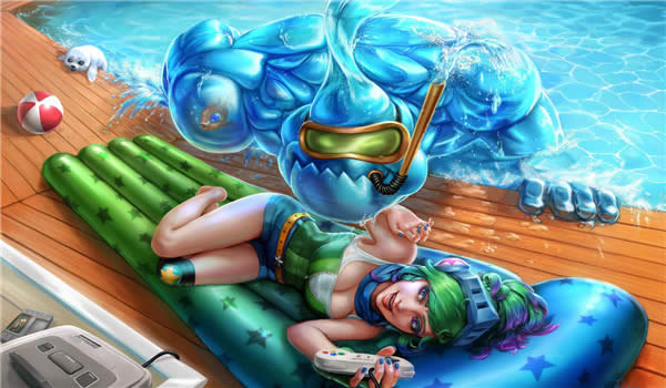 在原画中大量曝光的泳池派对系列啦,今年六月份,阿狸、俄洛伊、希维尔、巴德还有古拉加斯将会以全新的造型加入到这次夏季大狂欢中!