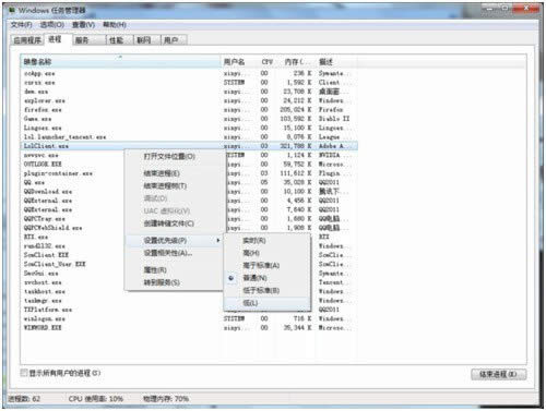 手动将LolClient.exe的优先级调低,并将LOL的优先级调高之后,玩家们的FPS性能可以获得明显的改善。手动设置这个选项能够使你的电脑优先将系统资源分配给LOL(游戏),而不是优先将资源分配给PVP.Net(聊天大厅)。