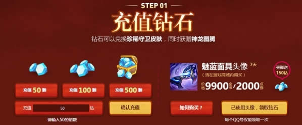 1在活动页面上使用Q币充值钻石,5Q币充值50钻石。在游戏客户端购买并使用魅蓝面具头像,赠送150钻石,每个qq号仅能领取1次钻石。充值的钻石会在页面上显示。