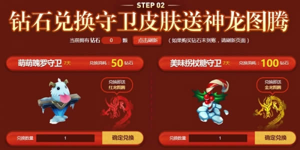 2使用钻石兑换守卫皮肤,其中50钻石兑换一份“萌萌魄罗守卫(7天)”,将获得赠“红龙图腾”一份;100钻石兑换一份“美味拐杖糖守卫(7天)”,将获得赠“金龙图腾”一份。兑换多份珍稀守卫皮肤,使用时间叠加计算。