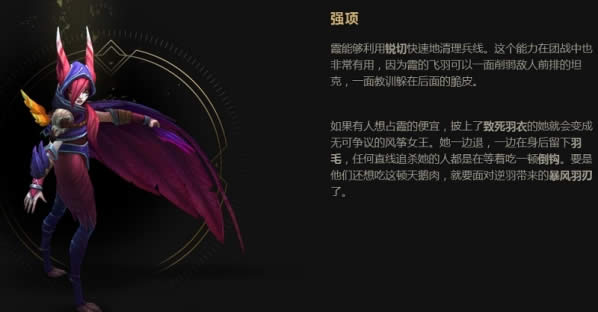 霞卷起一股羽刃的旋风,提升接下来几次普通攻击的攻击力和攻击速度。如果霞在致死羽衣激活期间攻击了敌方的英雄,她就会获得短暂的移动速度加成。