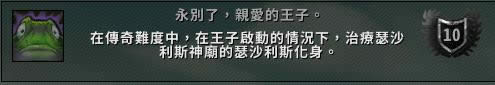進副本右手邊、往圖騰王的路上有很多巫醫怪,會施放妖術把人變成青蛙,這個青蛙可以互相傳染,成就即是要求隊伍在保持這個BUFF的情況下擊敗這個副本所有的BOSS。你可以選擇拖著一隻怪打這個BOSS、也可以選擇拿了BUFF後兩個人互傳打完全程。注意:這個成就理論上可以分次完成