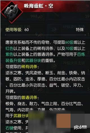 吸海垂虹作用是可提取60级或以上红色以上装备上的稀有词条,以及70级或以上紧色以上装备上的普通词条。产物可用于百炼装备升级和武器分块的重锻。使用方法是右键点击,然后点击符合条件的装备就可以提取稀有词条了。