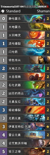 一套玩起来像战吼萨的快攻萨,现在的天梯环境快攻萨并不是很多,如果对面拿对付战吼萨的那套来对付你,那么我们就达到目的了。带了大量的元素牌,超多的低费随从,配合火舌图腾。一旦获得优势,就是狂风暴雨般的进攻,让对面来不及解场。卡牌同时还携带了一些AOE法术,也就是当我们能打脸,就选择随从打脸,法术解场。以最快的速度对对面造成伤害。