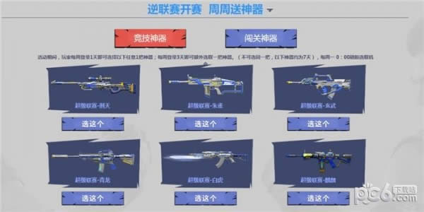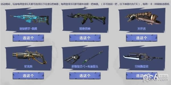 活动期间,玩家每周登录1天即可选择以下任意1把神器;每周登录3天即可额外选取一把神器。(不可选同一把,以下神器均为7天),每周一