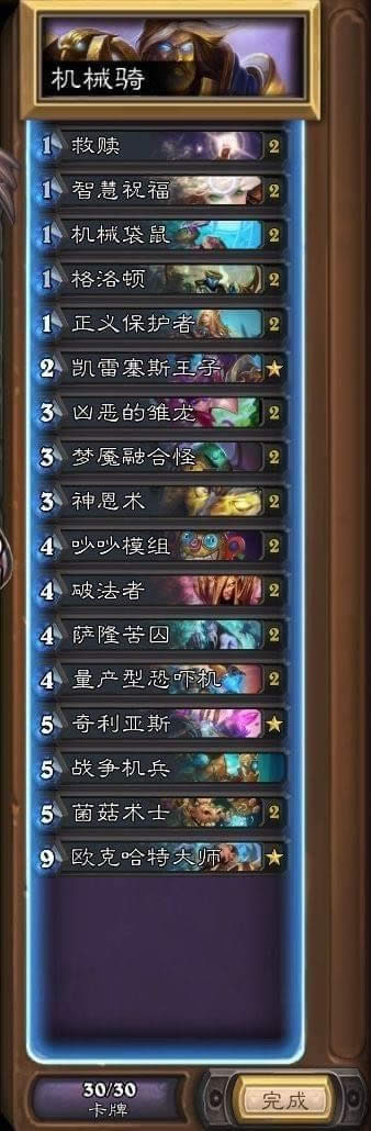经过大家的改进,这套卡组的构筑已经成熟了,欢迎大家偷偷上一波分,卡组名字我都想好了,这套卡组以机械为核心,本身我们又是骑士,其疾如风,就叫“疾风骑吧”