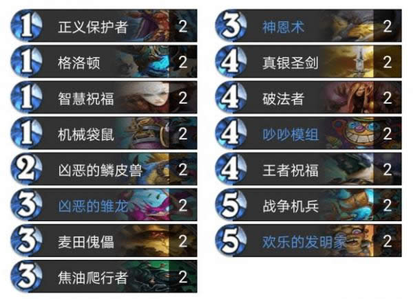 根据大家的建议将救赎替换了113机械,另外我觉得3费曲线太低,需要一点占场,将一张智慧祝福换成334
