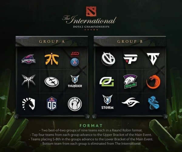 今年的国际邀请赛小组赛将十八支战队分为两组,A组有Winstrike、Fnatic、PSG.LGD、Mineski、EG、VGJ.T、Liquid、OG和iG九支战队,B组则是VG、PaiN、Team