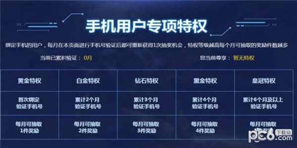 1.绑定手机的用户,每月在本页面进行手机号验证后都可重新获得1次抽奖机会,特权等级越高每个月可抽取的奖励件数越多