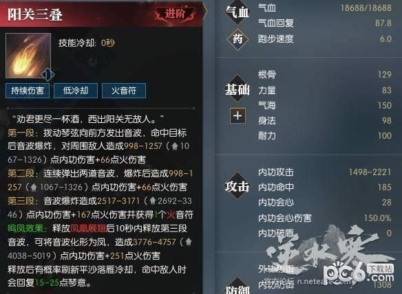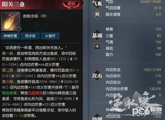 则10级阳关三叠技能伤害为:第一二段(0.36*内功攻击+397),第三段(0.91*内功攻击+998),鸣凤(1.35*内功攻击+1495)