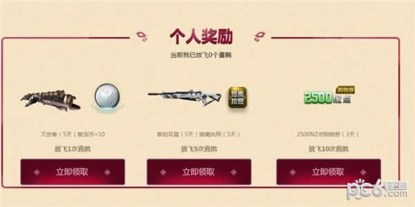 2.活动时间:8月10日-8月22日;放飞喜鹊机会每日清空,请当日使用。第一部分为全员放飞喜鹊进度,当全员放飞进度达到100%(放飞1000万喜鹊),即可领取永久专属双持UZI【个人奖励】栏目内奖励只能领取一次.
