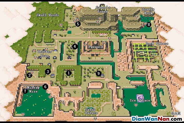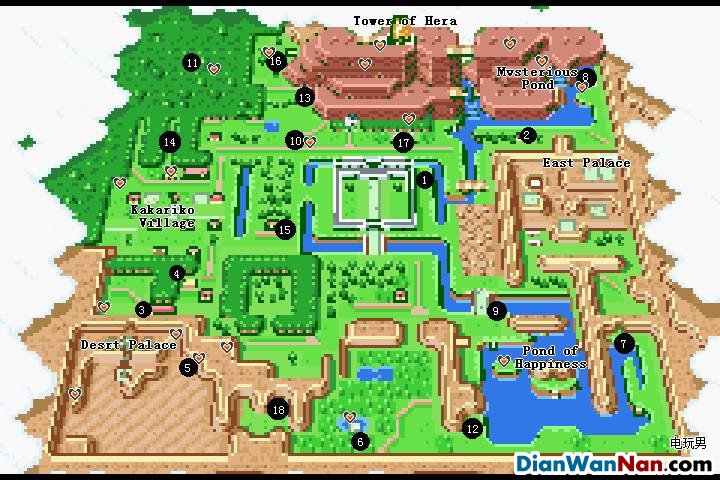 Sahasrahla,来到图中4的位置,这里有一个图书馆。用冲刺将书架上的古书撞下来,并取得它。之后来到图中6的位置,进入房子取得zhadan。进入房子的深处拉动右边的拉杆,水闸会打开。这时,外面池塘里的心之碎片会露出来。来到地图12处,炸开石壁,里面的人会送你300块钱(好人呐!)。继续前进,来到7的位置,进入洞中,撞那个石像,会出现一只发光的蜜蜂,用捕虫网抓住它。回到洞口,炸开旁边的石壁,里面有Sahasrahla所指的宝物—冰魔杖。现在整理好行装,前往沙漠宫殿(DesertPalace)。途中路过5处的山洞,里面有一块心之碎片。沙漠宫殿的入口被一尊石像堵住,在石板面前使用古书,进入内部。