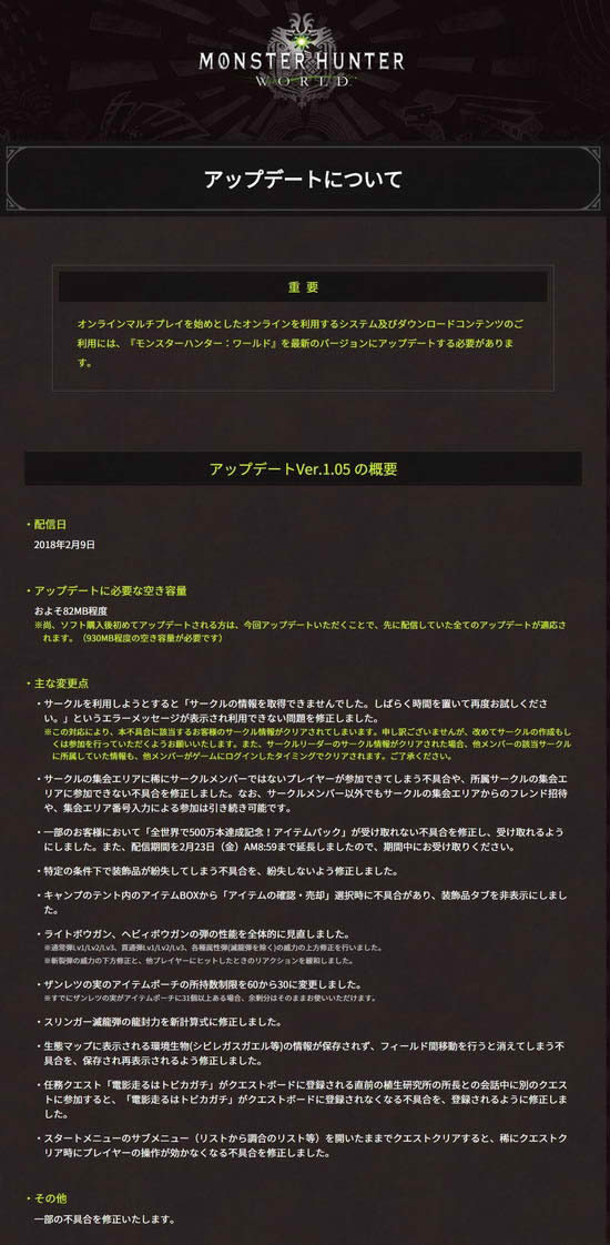 怪物猎人世界1.05更新了啥 怪物猎人世界1.05版本更新内容介绍