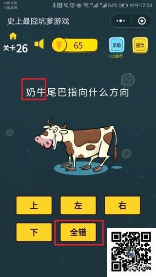 | 随着智能手机的迅速普及,与3G网络的快速发展,移动互联网的相关业务,已逐渐成为国内各厂商关注的焦点,中国手机游戏市场目前仍然以单机版游戏为主,网游版产品所占比重较低。从整体行业来看,中国手机游戏行业处于快速发展期,近两年来,在电信运营商和手机游戏开发商的联合推动下,中国的手机游戏行业,取得了较快的发展。 微信史上最囧坑爹游戏第26关是奶牛尾巴指向什么方向。难度比较简单,那么微信史上最囧坑爹游戏第26关怎么过呢?下面将给大家带微信史上最囧坑爹游戏第26关答案。 第26关