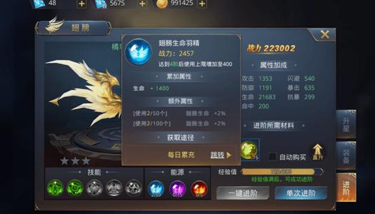 特殊翅膀只能升级培养,升级培养能够提高特殊翅膀属性。特殊翅膀进行升星时,每升星一定等级可使用重塑精华进行突破,突破后可获得额外属性加成。
