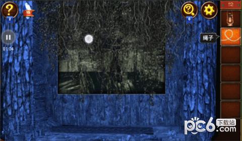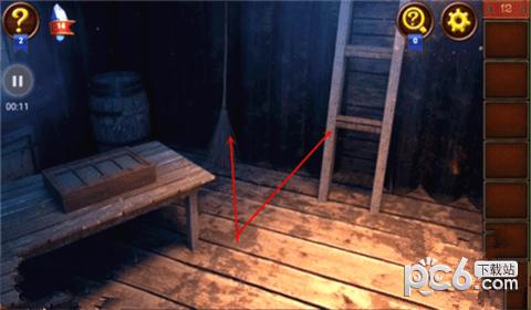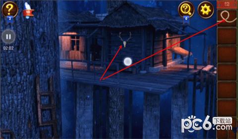 7、点洞内,收取对面墙上的鹿角,将之与绳子组合一起,将钩绳挂到梯子上,点梯子,梯子来到屋子处,再点梯子过关!