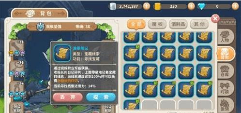 打开背包之后,点击【潦草笔记】,会弹出这个道具的说明,然后大家点击探索,就可以自动前往探索宝藏。