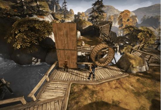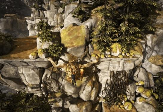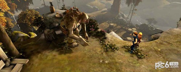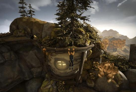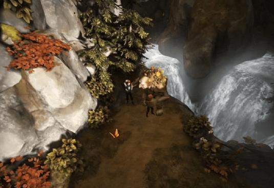 二 通过农舍之后经过刚在路过的粮仓的上方,会看见一个在哭的巨人,剧情结束之后,跟着巨人走,巨人会帮助兄弟二人翻过路上很多的障碍,踩着巨人肩膀过河后,爬到对面的枯藤上,等待巨人从下面爬上来在从巨人肩膀上爬过,让巨人江兄弟二人扔至对面后,爬到一个平台上,等巨人两手张开后与他互动,巨人会带着兄弟二人跳下瀑布。