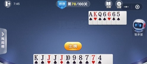 | 随着智能手机的迅速普及,与3G网络的快速发展,移动互联网的相关业务,已逐渐成为国内各厂商关注的焦点,中国手机游戏市场目前仍然以单机版游戏为主,网游版产品所占比重较低。从整体行业来看,中国手机游戏行业处于快速发展期,近两年来,在电信运营商和手机游戏开发商的联合推动下,中国的手机游戏行业,取得了较快的发展。 微信欢乐斗地主残局闯关困难第78关的手牌为KJJJJ1098774,下面就让我们一起来看下,斗地主残局困难模式78关攻略。