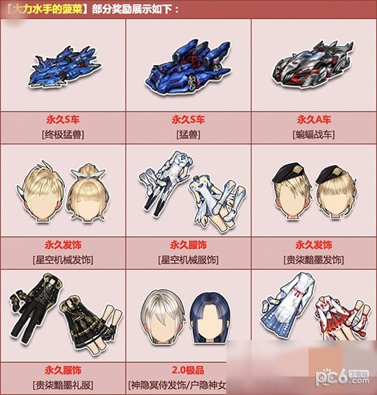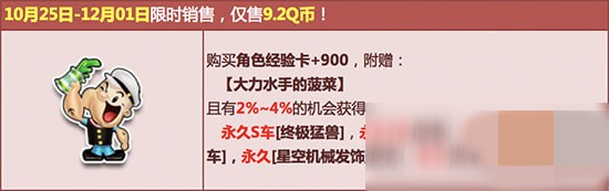 大力水手的菠菜 活动时间:10月25日-12月1日 活动地址:游戏商城 一、活动内容 活动期间,购买角色经验卡+900,有机会得永久S车【终极猛兽】/【猛兽】、永久A车【蝙蝠战车】、永久【星空机械发饰/服饰】/【贵柒黯墨发饰/礼服】或其他奖励之一! 核心极品期限型概率范围为:4%-6% 核心奖励永久型概率范围为:2%-4% 非核心奖励概率范围为:90%-94%