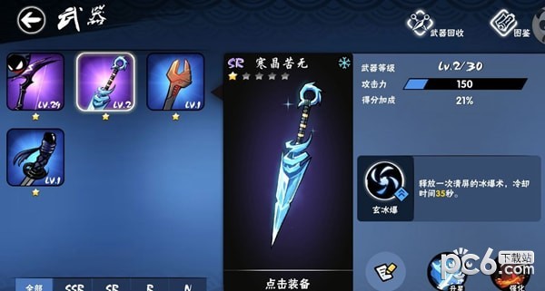 我觉得这把比那个SSR的苦无更好看,寒冰水晶的设计效果更是非常吸引人,而攻击力和得分加成也是中规中矩,技能方面则是非常强力,全屏的清屏攻击,很多玩家都喜欢清屏类型的技能,点一下世界都安静了。