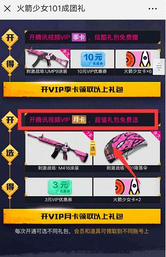 下拉页面可以看到M416粉色皮肤的获得方法,永久皮肤需要通过开通腾讯VIP年卡获得,不过只能从M4皮肤和101套装二选一。